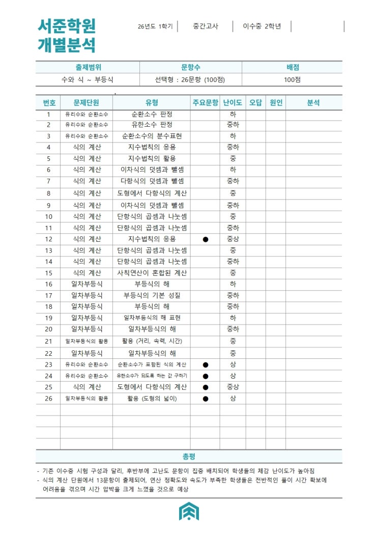이수중 2학년 2026학년도 1학기 중간고사 분석
