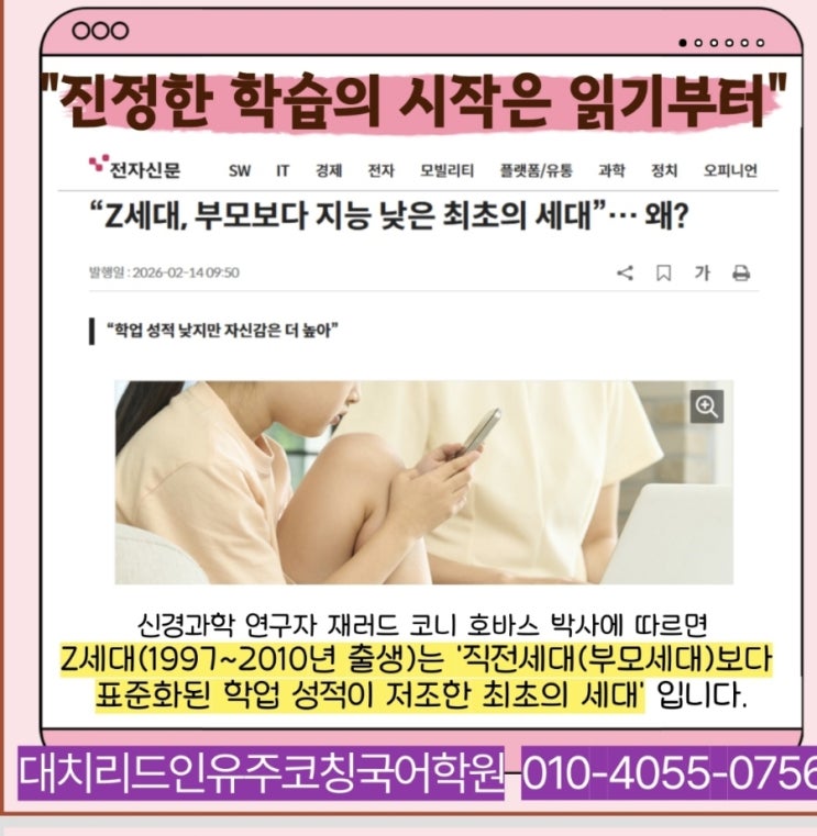 z세대의 읽기역량이 심각한 문제라는 기사가 났습니다. 부모세대보다 통상 다음세대의 학업성적이 높은게 정상적이지만 역전된거죠. <img src="https://blogthumb.pstatic.net/MjAyNjAyMTRfMTQw/MDAxNzcxMDU3ODQwODg2.jcaF4mo89E3LwoBOTcFNkRT2ovUGZapnbWJvUz_DEYUg.HLRCSGERmR-8Hrr0cx0vbRudPFgBGWKduZKZjyoS3VIg.JPEG/900%A3%DFScreenshot%A3%DF20260214%A3%DF172844%A3%DFPowerPoint.jpg?type=s3" />