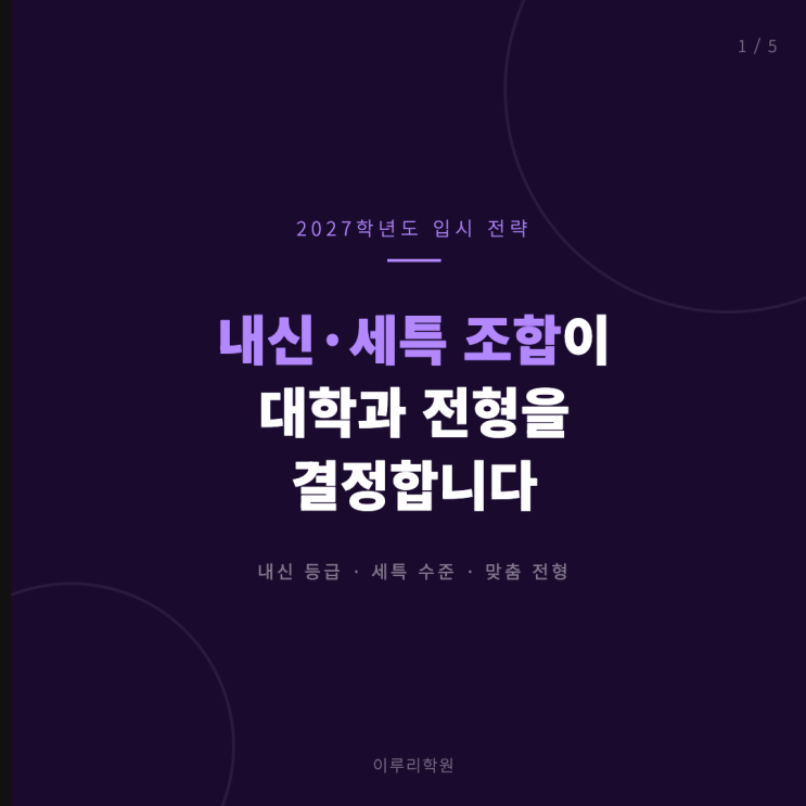 안녕하세요, 이루리학원 컨설턴트 김가인입니다. 상담을 하다 보면 학부모님들께서 이런 말씀을 자주 하십니다. 내신이 3등급대인데 좋은 대학은 이제 포기해야 하는 건가요? 세특을 열심히 쌓으면 내신이 좀 낮아도 커버가 되나요? 결론부터 말씀드리면, 2027학년도 입시에서는 내신 등급이 같아도 세특의 수준에 따라 지원 가능한 대학과 전형이 완전히 달라집니다. 오늘은 아래 세 가지를 중심으로 설명해 드리겠습니다. ① 내신과 세특 조합에 따라 달라지는 전형 선택 전략 ② 조합별 실제 추천 대학 및 전형 유형 ③ 세특을 어떻게 설계해야 하는지에 대한 핵심 방향 내신 1~2등급이라도 세특이 없으면 불리할 수 있습니다. 상위권 대학들....... <img src="https://blogthumb.pstatic.net/MjAyNjA0MjFfMTUy/MDAxNzc2Nzc2OTEyNDMw.RZlbNApYJOKkG5B7sUq7kp-iZJjqYhUYoPC8ytL9RB0g.bvZQenKkGVA-uCs_YnsMuXWQyBh521wHmKMAiVYHM0Qg.PNG/_Users_kimga-in_Downloads_EC9DB4EBA3A8EBA6AC_EB82B4EC8BA0EC84B8ED8AB9ECA1B0E.png?type=s3" />