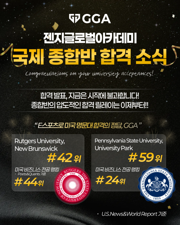 안녕하세요! 젠지글로벌아카데미입니다. 지난 uc머세드 합격 , 미네소타 대학 합격 포스팅 다들 확인해 주셨나요? 오늘은 미국 대학 랭킹 42위에 빛나는 Ruters University New Brunswick 합격 소식과 미국 대학 랭킹 59위에 빛나는 Pennsylvania State University, University Park 합격 소식을 전해드립니다! GGA 국제 종합반 합격 소식 특히 e스포츠를 전략적으로 활용하여 비즈니스 전공으로 합격한 케이스로 더이상 e스포츠가 단순히 '즐기는 게임'의 의미를 넘어서 높은 가치로 평가 받고 있다는 합격 사례일 것 같아요! 특히 Ruters University New Brunswick 럿거스의 경우 Poets&Quants 의 비즈니스 전공 랭킹 중....... <img src="https://blogthumb.pstatic.net/MjAyNjAyMTFfMTAw/MDAxNzcwNzk3MTIyMjQ5.zt4hMK_j7FqhQ_d9ZrROz2C7XbL0bxUhNUh4-xxtD7Qg.ymdTlXEwRBUslkIcRLX_PO7SfEu-wEXxsr5-B-hhUwMg.PNG/2026_%B7%B5%B0%C5%BD%BA%C6%E6%BD%C7.png?type=s3" />