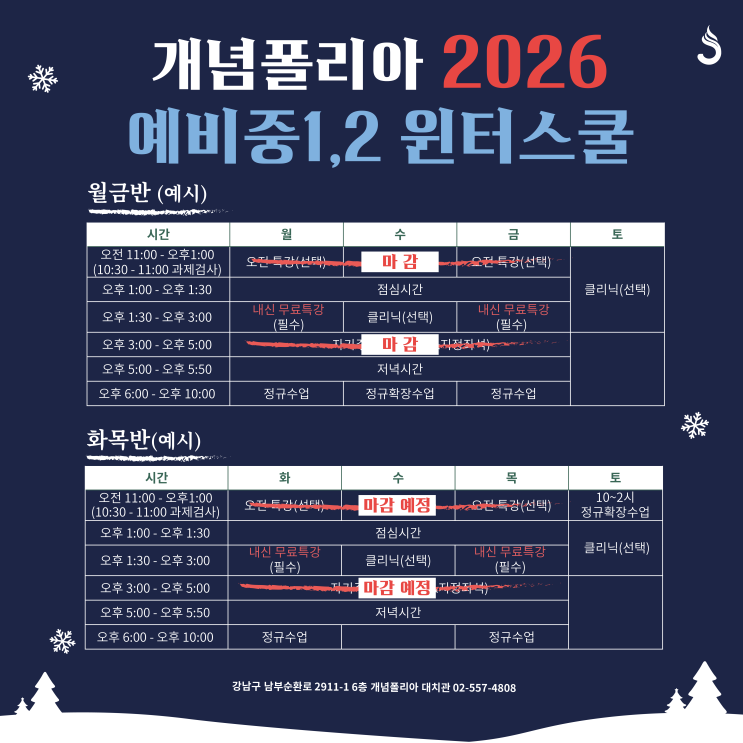 안녕하세요, 개념폴리아입니다. 2026학년도 예비중1·2 대상 윈터스쿨에 보내주신 많은 관심과 성원에 진심으로 감사드립니다! 수강을 희망하시는 분들께서는 마감 전까지 문의 및 등록 부탁드립니다. 감사합니다! <img src="https://blogthumb.pstatic.net/MjAyNjAxMDhfMTU1/MDAxNzY3ODQ4OTAzMDAw.WBWvzIzcdUS9gSRbT2I4Lk08E4bE4osnRGivNqIeeXQg.E9GyWa8qMKjqxk19uMcC_qqpsXJTEsrDdjrRW5SAuD8g.PNG/%C0%A9%C5%CD%BD%BA%C4%F0_%B8%B6%B0%A8_%BE%C8%B3%BB.png?type=s3" />