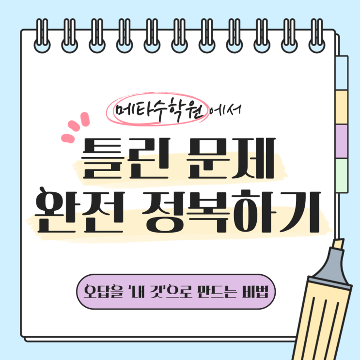 안녕하세요! 메타수학원입니다. 아이의 수학 공부에 대해 고민이 많으시죠? 개념은 이해한 것 같은데 막상 시험을 보면 실수가 잦고, 오답이 반복되는 패턴 때문에 걱정하는 학부모님들이 많습니다. 메타수학원은 이러한 고민을 해결하고 아이의 실력을 확실하게 '내것'으로 만드는 특별한 시스템을 갖추고 있습니다. 메타수학원만의 차별화된 학습 전략, 지금 공개합니다! 왜 우리 아이는 열심히 해도 수학 성적이 오르지 않을까요? 수학은 단순히 많은 문제를 푸는 것 이상이 필요합니다. '아는 문제'를 반복하는 시간보다, '틀린 문제'를 완벽히 정복하는 과정이 핵심입니다. 메타수학원은 우리 아이들이....... <img src="https://blogthumb.pstatic.net/MjAyNTEyMDlfMTAz/MDAxNzY1MjY1NDA4NTMw.MR293jnanki-TtkvXjxikbhaqDugDTnnoai1YxVuXNYg.8xmahB6okZp-aal4xMJIcoWTAjCVvL_QD8KJk8Q-9UMg.PNG/1.png?type=s3" />