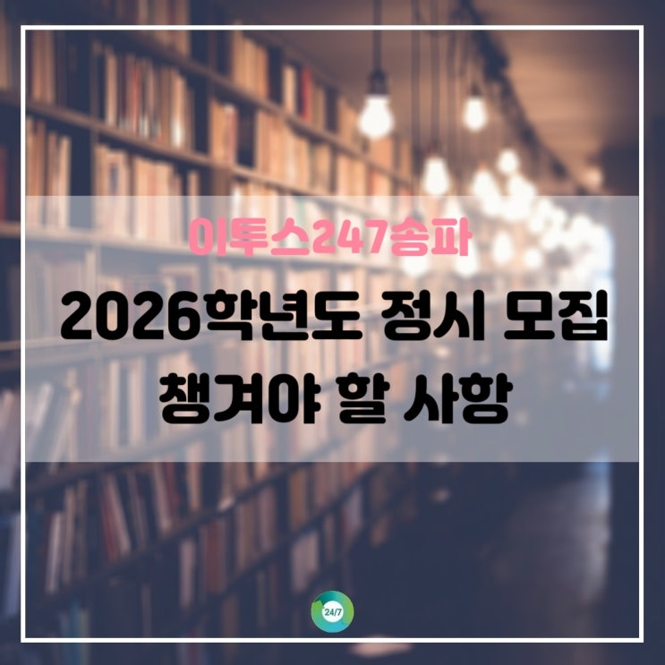 안녕하세요~ 이투스247송파 입니다! 드디어 12월 5일 수능 성적 발표가 이루어지면서 본격적으로 정시 시즌이 시작되었어요 원서 접수는 12월 29일부터 31일까지 3일 동안 진행되는데요 지원에 앞서 수험생 여러분들이 정시 모집에서 챙길 부분은 무엇일지 이투스247송파와 함께 알아볼게요 지원 대학 범위 설정 가장 먼저 해야 할 일은 성적을 꼼꼼히 분석하고 그에 맞는 지원 가능 범위를 정하는 거예요 대학마다 조금씩 차이가 있기 때문에 본인의 대략적인 위치 및 성적 유불리를 파악해야 하지요 표준점수, 백분위 합, 누적 백분위 참고 첫 단계에서는 우선 수능 점수를 기반으로 객관적인 분석에 들어가야 해요 입시기관 사이트를 활용하여....... <img src="https://blogthumb.pstatic.net/MjAyNTEyMDlfMTg2/MDAxNzY1Mjg1NjI2MzU3.p3PxzCXwYWYfJ1RYsVURyr-f6E3rEAFkulbvn2C_PxQg.JaDVydUdVagMwOQEIBKhj5lUZEkX3QB99acaMeHJtc0g.JPEG/6.jpg?type=s3" />