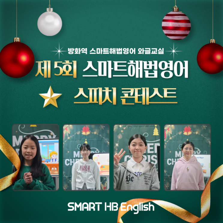 모두가 기다려온 제5회 스마트해법영어 스피치 콘테스트의 막이 올랐습니다! 이번 대회는 전국 스마트해법영어 학습자라면 누구나 참여할 수 있는 특별한 기회로, 학생들이 그동안 갈고닦은 영어 실력과 학습 역량을 자신 있게 뽐내고 한 단계 더 성장할 수 있는 소중한 경험이 될 것입니다. 저희 방화동영어학원 방화역 스마트해법영어 와글교실에서는 이번 대회 공지를 보자마자 몇몇의 학생들의 눈이 반짝이는 것을 느낄 수 있었어요. 이번 대회는 접수부터 마감까지 단 15일이라는 짧은 기간임에도 불구하고 평소 성실하게 학습해오던 우리 학생들이 먼저 큰 용기를 내어 참여 의사를 밝혀주었고, 적극적으로 준비하여 촬영까지 빠르게 마칠....... <img src="https://blogthumb.pstatic.net/MjAyNTEyMjBfMTYg/MDAxNzY2MTY3OTIwNjU2.IeCHbBUt-T27QkbGGM9DM1A_0C2m8S7B8KLNVUF8OKAg.Buki4WcaE-iGICqe6ATzkOCfmndEdngjiVNe6fxsuKsg.PNG/900%A3%DF%BF%CD%B1%DB%B1%B3%BD%C7%A3%DF%BD%BA%C7%C7%C4%A1%C4%DC%C5%D7%BD%BA%C6%AE.png?type=s3" />