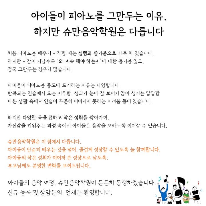 슈만음악학원은 아이들이 단순히 배우는 것을 넘어, 즐겁게 성장할 수 있도록 늘 함께합니다. 학부모님들께서도 "끝까지 잘 이어갈 수 있다"는 신뢰를 느끼실 수 있습니다. 아이들의 음악여정 슈만음악학원이 든든히 동행하겠습니다. * 슈만음악학원에서는 재원생들의 이탈이 거의 없습니다. 그렇기에 이별이 있다면, 이사로 떠나는 학생이 가장 그리운 순간이 됩니다.... *학군지 특성상 고학년이 될수록 학원 스케줄이 바빠집니다. 부모님은 무리되지 않을까 염려해 쉬자고 하시시만, 학생이 먼저 "계속다니겠다" 고 말해줄 때가 있습니다. 이런 소중한 인연들을 만날수록 더 잘 가르쳐야겠다는 마음이 깊어집니다. *예술....... <img src="https://blogthumb.pstatic.net/MjAyNTEyMTFfMjEw/MDAxNzY1NDU0NzMzODkz.hM6Csu2Fc5HOYK0rwKOIw2-2xqU17Wpx3OeJVVN7CfMg.IZxrPBtwMs9SAB-zQIafba1O-brp-dlij1cB2HJUmIIg.JPEG/%C1%A6%B8%F1%C0%BB_%C0%D4%B7%C2%C7%D8%C1%D6%BC%BC%BF%E4._%284%29.jpg?type=s3" />