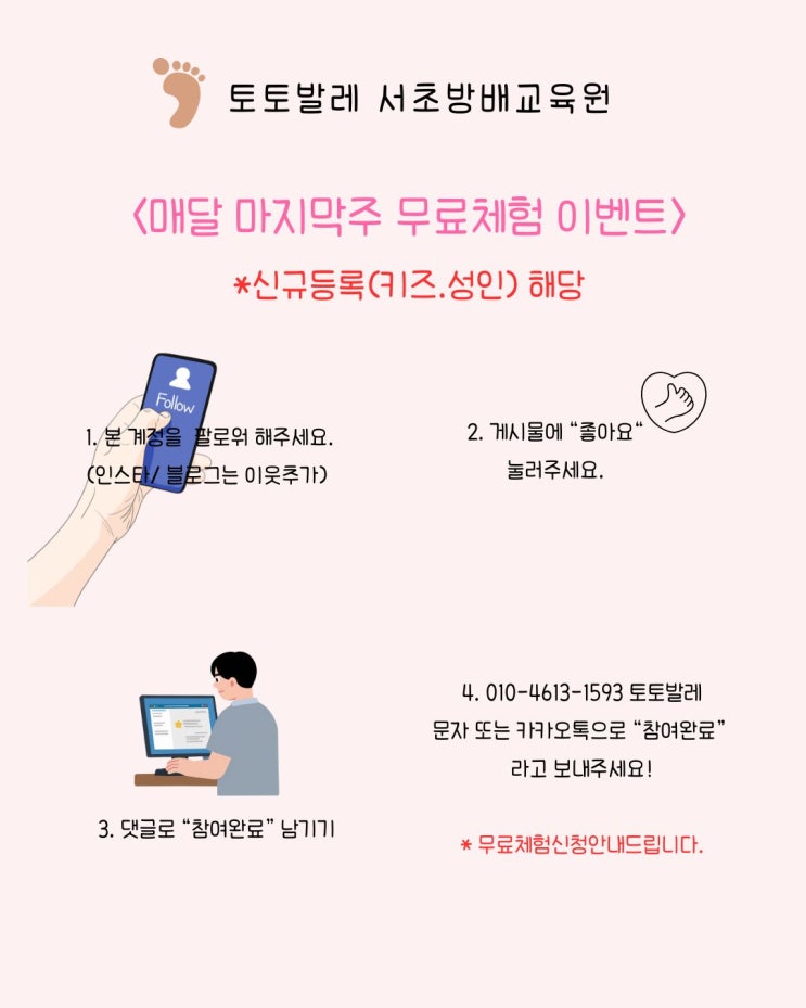 안녕하세요. 토토발레 서초방배교육원입니다. 매달 마지막 주 1회 무료체험 이벤트 소개드립니다. *신규생 키즈/성인 모두 해당되오니 많은 참여부탁드립니다. *체험수업 정원이 마감된 경우, 참여가 연기될 수 있음을 미리 안내드립니다. *문의: 010-4613-1593 (문자 또는 카톡상담) 방배역1번출구 위, 약380미터 직진, 방배그랑자이 맞은편 <img src="https://blogthumb.pstatic.net/MjAyNjAxMTdfMyAg/MDAxNzY4NjI1MDYwOTg3.XQLEzTpREXNCob1cCQ6Xu887RnOd3Lr0UInQNfms6msg.e2pfLkWGaN_xgEXBVxtNgtTdSMjPNrzdvfD74-r3ToUg.JPEG/%C5%E4%C5%E4%B9%DF%B7%B9_%BC%AD%C3%CA%B9%E6%B9%E8%B1%B3%C0%B0%BF%F8_%282%29.jpg?type=s3" />
