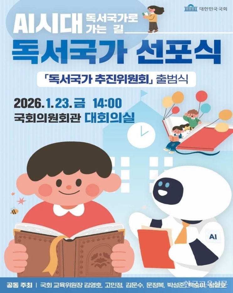 행복한 배움터 답십리초앞 예섬학원입니다 김영호 국회 교육위원장은 독서국가 선포식에서 “책 읽는 습관, 5세~10세 골든타임…독서 유치원, ‘독서국가’로” AI 시대를 준비하기 위해 국가 차원의 독서 국가 비전을 강조했습니다. 독서 교육을 문해력, 비판적 사고, 창의력 같은 능력을 기르기 위한 필수 교육으로 봅니다. 5세~10세(특히 초등 전)를 독서 습관의 골든타임으로 보고 이 시기에 책과 친해지지 못하면 이후 독서 습관 형성이 어려울 수 있다고 지적했습니다. 교육 정책 방향 독서 유치원과 독서 중점 학교 같은 생애 주기별 독서 강화 제도를 제안했고 초등, 중학교, 고등학교까지 독서 기반 교육을 체계화해야 한다고 했습니다....... <img src="https://blogthumb.pstatic.net/MjAyNjAxMjlfMjE4/MDAxNzY5NjU0MjY2NzAx.r3tcNiPCPZvC6YUs5k4SsegSNCELG53N5j7jyvCxra8g.nqHsdTN_J9pHnvA9_toEt6DeastlKVG5jo4merVH2DYg.JPEG/art%A3%DF17689480267842%A3%DFccca1b.jpg?type=s3" />