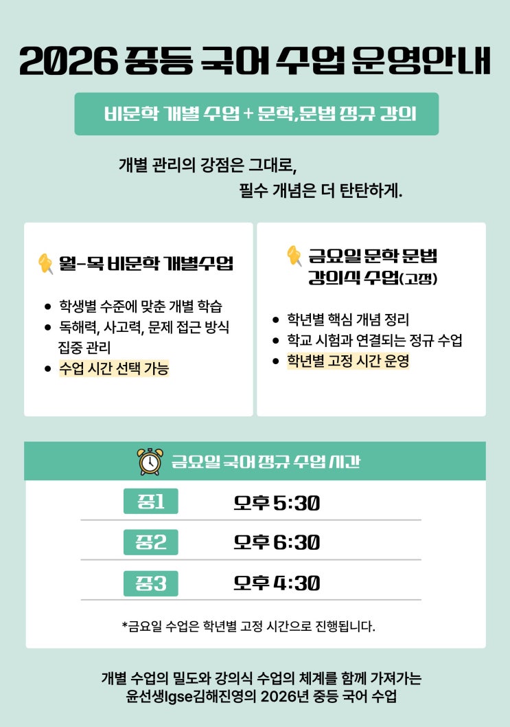 안녕하세요. 윤선생Igse 김해 진영학원입니다. 2026년부터 중등 국어 수업 운영 방식에 변화가 있어 안내드리고자 합니다. 그동안 중등 국어 수업은 매일 1시간, 학생별 수준에 맞춘 개별 수업으로 운영해왔습니다. 학년이 올라갈수록 문학·문법 영역에 대한 체계적인 정리가 필요하기에 2026년부터는 기존 개별수업의 장점은 유지하면서, 금요일 고정 ‘강의식 수업’을 추가합니다. 학생들이 흔들리지 않고 국어의 기본 체력을 안정적으로 쌓을 수 있도록 계속 보완해 나가겠습니다. 감사합니다. <img src="https://blogthumb.pstatic.net/MjAyNjAyMTBfMjgx/MDAxNzcwNjgyODI2Mjk3.Gr7eo5fk7Q8twWRRtgLILms9EKDNRJlFvezAsqHTJLwg.FrXClEPIidaaDiH0yKD0R_4LURidMskVFx_jnPv9xDcg.JPEG/%C1%A6%B8%F1%C0%BB_%C0%D4%B7%C2%C7%D8%C1%D6%BC%BC%BF%E4._%283%29.jpg?type=s3" />