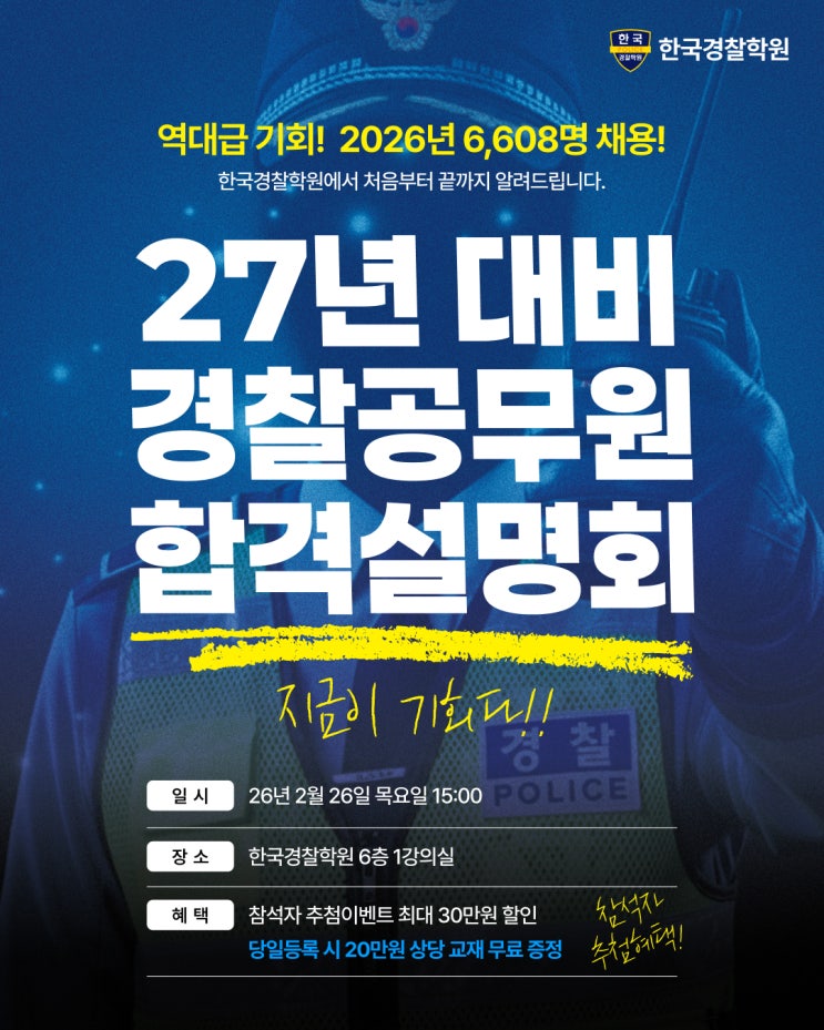 안녕하세요. 대구/경북 합격의 중심 대구경찰공무원학원 한국경찰학원입니다. 2026년 경찰공무원 채용인원이 대규모로 증원되며, 경찰공무원을 준비하는 사람들이 많이 늘었는데요! 아마 이 글을 보고 계신 분들도 "지금 시작하면 나도 가능할까?", "내년 시험은 어떻게 준비해야 하지?" 라는 기대와 불안을 동시에 안고 오셨을 겁니다. 하지만 쏟아지는 광고 글 속에서 진짜 필요한 정보를 찾기란 쉽지 않으셨을 거예요. 오늘은 단순한 학원 홍보가 아니라, 2027년 합격을 목표로 하는 분들이 반드시 체크해야 할 3가지 변수와 이를 해결해 줄 합격전략 설명회 정보를 냉철하게 분석해드립니다. 1) 숫자에 속지말고 배경을....... <img src="https://blogthumb.pstatic.net/MjAyNjAyMTBfNTQg/MDAxNzcwNzIzNDAzMzk3.S8GWxGseyD9LQbqtUwX-KP2rF-46UK3A92veanBQZAMg.RcoErutgc7rV2Yqr0r1Vwqv_9MWMPtldO75h7Y11Zacg.JPEG/KakaoTalk_20260210_175313205.jpg?type=s3" />
