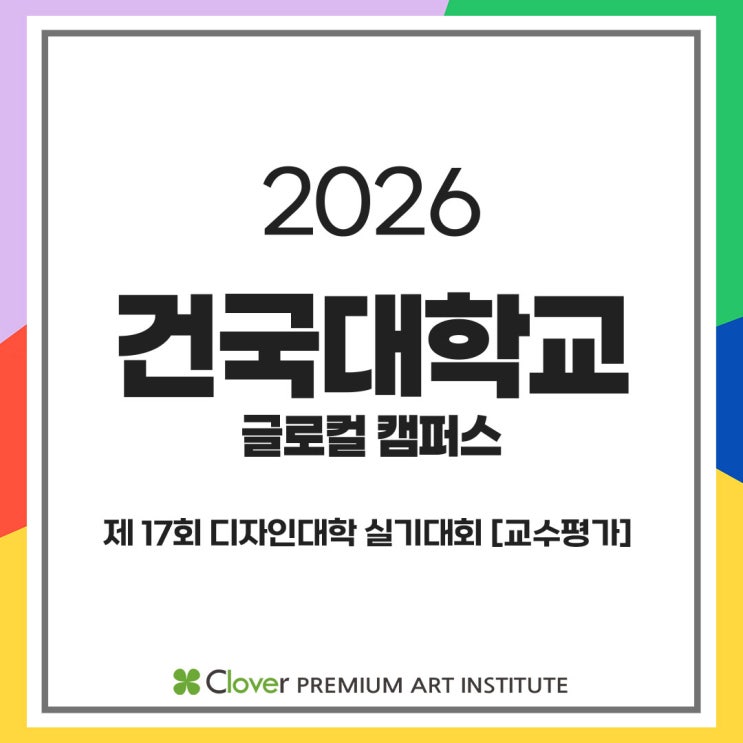안녕하세요 :) 2026 실기대회 소식을 안내드리는 클로버입니다! 이번 안내드릴 실기대회는 충주시에 위치한 건국대 글로컬 캠퍼스의 실기대회 소식입니다. 건국대 실기대회의 경우 타 대학과 다르게 디자인, 만화, 회화 등 다양한 실기 유형으로 진행되며 입시부와 예비부를 분리평가한다는 특징이 있습니다. 디자인외 다른 입시유형을 준비하거나 자신의 실기력을 객관적으로 확인하고픈 예비반 학생들에게는 좋은 기회가 될 듯 하네요 ^^ 또한 매년 건국대 글로컬 실기대회의 경우 본교 교수가 직접 평가하며 본상 수상자에게는 직접 교수에게 그림에 대한 서면평가를 받을 수 있는 기회가 주어지는 만큼 입시생들에게는 유익한 경험이 되지 않....... <img src="https://blogthumb.pstatic.net/MjAyNjA0MjlfMyAg/MDAxNzc3NDM2NTgwMzQ3.HyaBop9mAes0ti35l6X-VaM74XDVC5aslzVfVRSZ8BEg.wDZEs7NE7qBRjMtbpds14QW7awidEpeymTneOc9J3oog.JPEG/1.jpg?type=s3" />