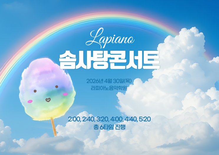 안녕하세요. 프리미엄 음악교육 라피아노입니다:) 솜사탕 콘서트가 아이들과 함께하는 따뜻한 시간 속에서 잘 마무리되었습니다 ^^ 정성껏 연주하는 모습에서 아이들의 성장을 다시 한 번 느낄 수 있었던 시간이었습니다. 학부모님, 형제자매, 그리고 친구들과 함께하는 그 어느 때보다 따뜻한 공연이었습니다. 용기 내어 연주해준 우리 아이들과 옆에서 따뜻하게 응원해주신 부모님들께 진심으로 감사드립니다. 오늘의 작은 경험이 앞으로의 음악 여정에 자신감으로 이어지기를 바라며, 라피아노는 앞으로도 아이들이 즐겁게 성장할 수 있도록 세심하게 지도하겠습니다. 오늘의 기억이 오래도록 아이들 마음에 남기를 바랍니다. 함께해주셔서 감....... <img src="https://blogthumb.pstatic.net/MjAyNjA0MzBfOTYg/MDAxNzc3NTU4MzQ5NjI1.PrIE5zyFAw_x7QYcJncP9EaB1Du9e8IkOJYB9g2YWCkg.cpbnEFRYQ2IpVbKXBE1SeygcCQd7tcRcUUlppJE0tW0g.PNG/%BC%D8%BB%E7%C5%C1%C4%DC%BC%AD%C6%AE-_%BA%B9%BB%E7%BA%BB_%281%29.png?type=s3" />