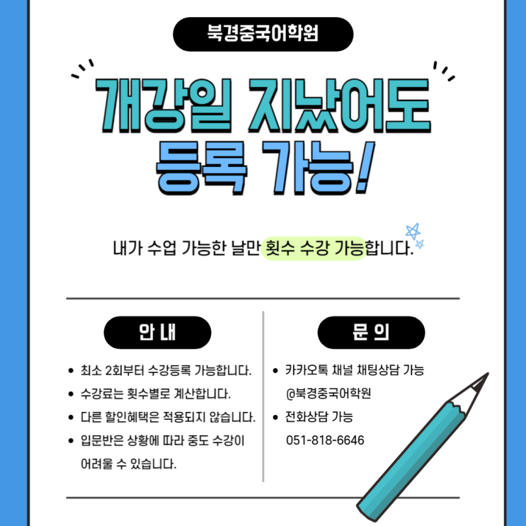 부산 서면 중국어 전문학원 북경중국어학원입니다 지금도 1월 수업 등록 가능합니다! 내가 수업 가능한 날만 횟수 수강 가능! *입문반(중국어가 처음이신 분)의 경우 중도에 수강이 불가능할 수 있습니다 카톡채널이나 전화로 문의해 주시면 개설된 수업에 등록 가능한지 안내해 드리겠습니다 :) ▼ 카카오톡 채널 ▼ 인스타그램 <img src="https://blogthumb.pstatic.net/MjAyNjAxMDlfNzYg/MDAxNzY3OTM0NjgyNDgw.pa_VT_MCWPSfUVjjOQdF5aONMHQjvqyVgJqUJW5caHwg.GbMVUzI7SHuI8SAvkSjELaQqiyuUkz9VJR0i6DZiXxcg.PNG/1%BF%F9%C0%DA%C0%B2%BC%F6%B0%AD%C1%A6.png?type=s3" />