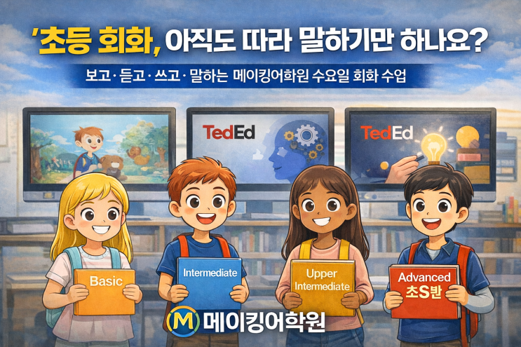 “초등 회화, 아직도 따라 말하기만 하나요?” 보고·듣고·쓰고·말하는 메이킹어학원 수요일 회화 수업 초등 회화 수업을 고민하는 학부모님들이 가장 많이 하시는 걱정은 이것입니다. “회화 수업인데… 그냥 말만 시키는 건 아닐까?” “재미는 있는데, 실력으로 이어질까?” “중·고등 가면 결국 독해·서술·논술인데 도움이 될까?” 메이킹어학원의 수요일 초등 회화 수업은 이 질문에서 출발했습니다. 말만 하는 회화가 아니라 '실력'으로 연결되는 회화 수업 수요일 회화 수업의 핵심 한 줄 요약 보고 → 듣고 → 쓰고 → 말하는 4단계가 모두 들어간 ‘완성형 영어 수업’ 그래서 단어만 아는 영어 ❌ 흉내 내는 말....... <img src="https://blogthumb.pstatic.net/MjAyNjAxMTRfMjM0/MDAxNzY4Mzg4MTcyOTQ5.HI8Z_vpwCPq7fWAbWLHaPO55fMa27rvTYPx-q8qqfkcg.7dhkxyMZ4tTGhjEGtS2OyMIdysM2vJOYeOgrvdODh2sg.PNG/1.png?type=s3" />