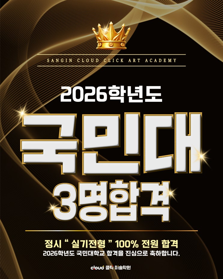 [ 2026 국민대 합격자 ] 안녕하세요~ 대구미술학원 대구입시미술학원 상인동미술학원 달서구미술학원 신월성미술학원 상인클릭미술학원입니다~ 오늘은. 2026학년도 국민대합격자 소식입니다. 오늘 오후 5시. 국민대 정시모집 발표가 있었죠. 얼마나 조마조마한 마음으로 기다렸던지.. 네이버시계를 켜두고 5시가 되기만을 기다렸네요. 대한민국최고의 디자인대학인만큼 어찌나 심장이 바쁘게 뛰던지..ㅎㅎ 발표를 기다리며 기도했던 간절한 마음이 전해 진 걸까요! 지원했던 학생 2명 모두 합격을 했습니다. 대구미술학원 대구입시미술학원 상인동미술학원 달서구미술학원 신월성미술학원 상인클릭미술학원에서 2026 국민대 정시모집에 실기전형....... <img src="https://blogthumb.pstatic.net/MjAyNjAxMTZfMTA3/MDAxNzY4NTY1NjU2Mzg3.ZAlVC_pgF6-LFEJTh6lwpIDHAhMhAbNh4b1ZVZRf3WMg.wqhHbC6F_sm0yHpe6xwbL1P7H6d04b9YvGg2n9PNeg4g.JPEG/%BB%F3%C0%CE%B5%BF%B9%CC%BC%FA%C7%D0%BF%F8_%281%29.jpg?type=s3" />