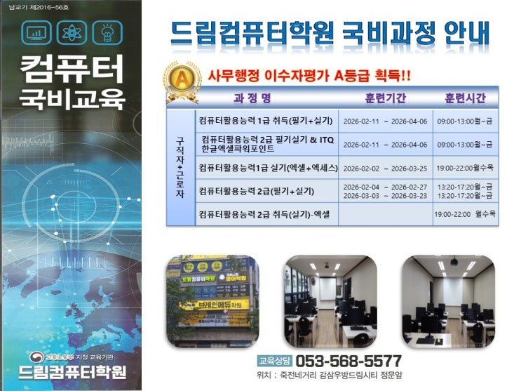1. 컴퓨터활용능력 2급 필기+실기 ☆ 개강일 : 2/4, 3/3 (13시20분-17시20분) ☆ 수강료 : 360,000 (내일배움카드 사용시 198,000 본인부담) ☆ 교재무료제공 2. 컴퓨터활용능력 1급 필기+실기 ☆ 개강일 : 2/11 (9시-13시) ☆ 수강료 : 840,000 (내일배움카드 사용시 462,000 본인부담) ☆ 교재무료제공(교통비 월최대 5만원 지급) 3. 컴퓨터활용능력 2급 필기+실기 & ITQ한글엑셀파포 ☆ 개강일 : 2/11 (9시-13시) ☆ 수강료 : 840,000 (내일배움카드 사용시 462,000 본인부담) ☆ 교재무료제공(교통비 월최대 5만원 지급) 4. 컴퓨터활용능력 1급 실기 ☆ 개강일 : 2/2 (19시-22시, 월수목) ☆ 수강료 : 360,000 (내일배움카드 사용시 198,....... <img src="https://blogthumb.pstatic.net/MjAyNjAxMTZfMjEz/MDAxNzY4NTI2MTM0NzIw.tDtKRUvwBjUnChAa_LI268Bc0GcJ6alC8DZBl_EaZuYg.YkIFSZcN0VLsZAaFrrkBfS-2-gyBNB2J9GPy84hNpucg.JPEG/%B5%E5%B8%B2%C4%C4%C7%BB%C5%CD%C7%D0%BF%F8_%B0%ED%BF%EB%BC%BE%C5%CD_%C8%AB%BA%B8%C0%DA%B7%E1.jpg?type=s3" />