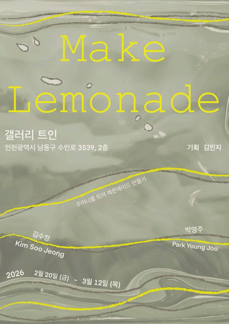 안녕하세요, 갤러리트인입니다 이번 전시는 일상의 아주 사소한 장면과 감정에서 출발한 두 작가의 회화를 소개하는 2인전 〈주머니를 뒤져 레몬에이드 만들기 Make Lemonade〉입니다 영어 관용구 make lemonade는 불리한 상황이나 이미 지나가버린 감정을 새로운 가능성으로 바꾸는 태도를 의미합니다 이번 전시는 이 표현을 작업의 출발점이자 공통된 제작 태도로 삼아 반복되는 삶의 순간들이 어떻게 회화적 언어로 전환되는지를 보여줍니다 참여 작가 소개 김수정 김수정 작가의 회화는 사물의 정확한 형태를 재현하기보다는, 그것이 남긴 감정의 자취를 따라가는 데서 시작됩니다 가방 속에 들어 있는 물건들은 단순한 소지품이 아니라 관계....... <img src="https://blogthumb.pstatic.net/MjAyNjAyMTFfMjc2/MDAxNzcwNzczMjczNjIx.oqq996RBekWhv8812pUdpN5IGN7r1Mw-OV16buk2WG0g.KEThfnqW-FPb8p03-Y7u-UMo4jX70zyiPqUta63buu0g.JPEG/Make_Lemonade_A3_1.jpg?type=s3" />
