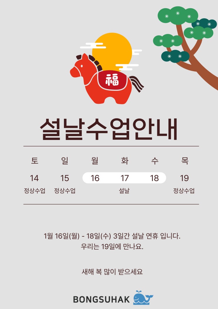 안녕하세요~ 구월동 수학학원계의 봉, 봉수학학원의 봉매지기 인사드려요~~ 곧 있으면 민족의 대명절, 설연휴가 시작되는데요~ 대체휴무라도 끼어서 더 쉴 수 있길 살짝 꿈꿔봤지만 달력을 들여다보니 에잇 이번 설은 틀렸습니다ㅋㅋㅋ 게다가 3월 신학기를 코앞에 두고 있는 요즘, 봉수학은 이곳저곳 개강준비에 또 지금 하고 있는 윈터스쿨에 더 쉬어갈 틈이 없는 게 사실인데요~ 2026년 봉수학은 설연휴동안 수업이 어떻게 진행될까요? 우선 윈터를 제외하고 말씀드리겠습니다~ 봉수학 주말 정규반은 물론 주말보충까지도 정상적으로 운영이 된답니다. 오로지 설날전날-설날당일-설날다음날로 이어지는 달랑 연휴만 쉬어가는 거죠. 너무 무리....... <img src="https://blogthumb.pstatic.net/MjAyNjAyMTRfNTIg/MDAxNzcxMDMyMjY2MTA5.So4qcJSa-QZixEul6oaGl3oolN__HBd1xkD1hFmrJRQg.K5JJidsWc3PBw9C5LxKI_mUHS2wO2-aP_XImrKfmkhcg.JPEG/%BC%B3%BF%AC%C8%DE%BB%F5%B0%ED.jpg?type=s3" />