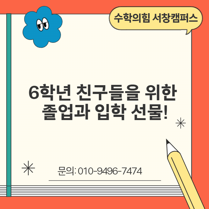 안녕하세요. 수학의힘 서창캠퍼스입니다. 어느덧 겨울의 끝자락, 6학년 친구들과 함께한 시간이 또 하나의 추억으로 남는 순간이 찾아왔습니다. 얼마 전 저희 수학의힘 서창캠퍼스에서는 초등 과정을 마무리하는 6학년 친구들에게 졸업과 입학을 축하하는 작은 선물을 나누는 시간을 가졌습니다. 학습할때마다 조심스럽던 아이들이 이제는 스스로 문제를 분석하고 풀이 과정을 설명할 만큼 훌쩍 성장했습니다. 어려운 단원을 끝까지 붙들고 고민하던 시간도 모두 소중한 과정이었습니다. 그 시간을 함께 해왔기에 이번 졸업은 더욱 특별하게 느껴졌습니다. 저희는 단순히 선물을 전달하는 자리가 아니라, 아이들의 지난 노력을 인정하고 앞으로의....... <img src="https://blogthumb.pstatic.net/MjAyNjAyMjVfMTI5/MDAxNzcyMDAzMTE2NzA1.V4FBlADoxkngEe8z7vpQQgzRtDt-ttY204BwVWR38g8g.BXm1hMoMNMOOqvfRrhWwBCCBf-Umvm-D8t9jfugxnKcg.PNG/image.png?type=s3" />