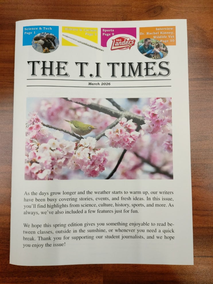 안녕하세요 TI 영재영어학원입니다! 따스한 봄 햇살과 함께 우리 학생들의 열정이 가득 담긴 영문 신문, [THE T.I TIMES] 3월 호가 드디어 발행되었습니다. 이번 3월 호도 마찬가지로 학생들이 직접 흥미로운 주제를 정하고 취재하고 작성한 기사들로 꾸며져 그 어느 때보다 알차고 생동감이 넘치는데요. 어떤 흥미로운 이야기들이 담겨 있는지 살짝 소개해 드릴게요! 이번 호 주요 하이라이트 Science & Tech (P.1): 하늘의 제왕, 독수리에 대한 심도 있는 탐구 History & Culture (P.3): 역사의 숨결을 느낄 수 있는 문화 이야기 Sports (P.9): 뜨거운 열기의 SSG 랜더스 소식 Special Interview (P.10): 야생동물 수의사 (W....... <img src="https://blogthumb.pstatic.net/MjAyNjAzMDlfMjA5/MDAxNzczMDM3MjY3MTU3.BnkRNjTSbCNUlp6FRANQqTeQbCgGtOQrztIly88TUNYg.OyfYEIC_tyfXqE6TnVy47ISGFXfaYCnGgLVjl0y2-Kkg.JPEG/900%A3%DF20260309%A3%DF144449.jpg?type=s3" />