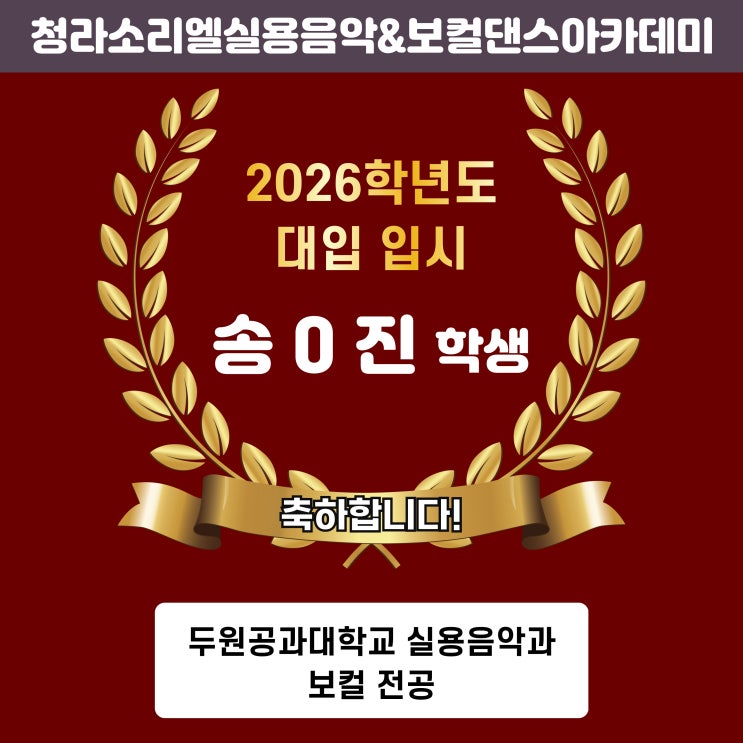 안녕하세요, 입시, 오디션 전문 청라보컬학원 소리엘입니다! 새해가 밝은지 얼마되지 않아 좋은 소식을 전하게되어 얼마나 감사한지 모릅니다. 저희 학원에서 유일하게 고3 이었던 학생이 조금 늦게 보컬 입시를 준비하게되었는데요, 힘들었던 과정들속에서 좋은 결과를 얻게되었습니다! 올해 대입은 난관의 연속이었습니다. 그 이유는 올해의 대입 경쟁률이 그 어느때보다 더욱 치열했기때문인데요, 이는 "황금돼지띠"의 해에 출생한 학생들이 대입을 치루는 시기였기 때문입니다. 전년도 대비 경쟁률이 2배~3배정도가 더 올라서 더욱 힘들었던 시기였지만 수강생이 합격하게되어 너무 다행이고 감사합니다! 실용음악 보컬 입시는 모....... <img src="https://blogthumb.pstatic.net/MjAyNjAxMTJfMjk3/MDAxNzY4MjAwMzcwNjA1.kGHer0rwzUMwouUtwi-OSuHMGEhyEhrjnNPRRYPwLEEg.pD2YpeEaISoPPKUTzC1HnwGCm1JuI4tdqDh5So0iXpMg.JPEG/26%B3%E2%B5%B5%B4%EB%C0%D4%C7%D5%B0%DD%C0%DA%C8%AB%BA%B8-001.jpg?type=s3" />