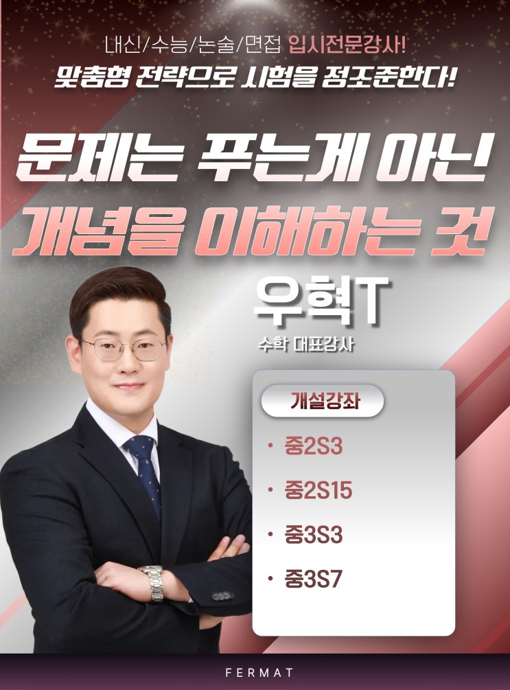 수학을 가르치다 보면 아이들이 틀리는 이유가 모르기 때문이 아니라 알고 있는 것들이 서로 이어져 있지 않아서 생기는 경우가 참 많습니다. 공식은 외웠는데 왜 쓰는지는 모르겠고 문제의 조건은 읽었지만 어떤 개념과 연결해야 하는지 헷갈리고 배운 것은 많은데 시험만 보면 머릿속이 하얘지는 경우도 흔합니다. 이우혁T는 이런 상황을 누구보다 깊게 관찰해온 선생님입니다. 그래서 우혁 선생님의 수업은 흩어진 개념들을 하나의 흐름으로 다시 연결하는 데 집중합니다. 문제를 빨리 푸는 법을 알려주는 수업이 아니라 문제가 왜 이렇게 만들어졌는지 어떤 개념을 전제로 하는지 아이 스스로 설명할 수 있게 만드는 수업입니다. 오늘은 중2~....... <img src="https://blogthumb.pstatic.net/MjAyNjAxMTZfMTUg/MDAxNzY4NTQ4NDI5NDY5.3d4SNcH1VV9nzHbwReorflqKk80d4m_shTyjMf7q2IAg.z4KwsvxDamwDyVsj9Ue3cPFnP4El_o6Adg_1-4Exc40g.JPEG/%B0%AD%BB%E7%C7%C1%B7%CE%C7%CA-_%BA%B9%BB%E7%BA%BB2-_%BA%B9%BB%E7%BA%BB_%281%29.jpg?type=s3" />