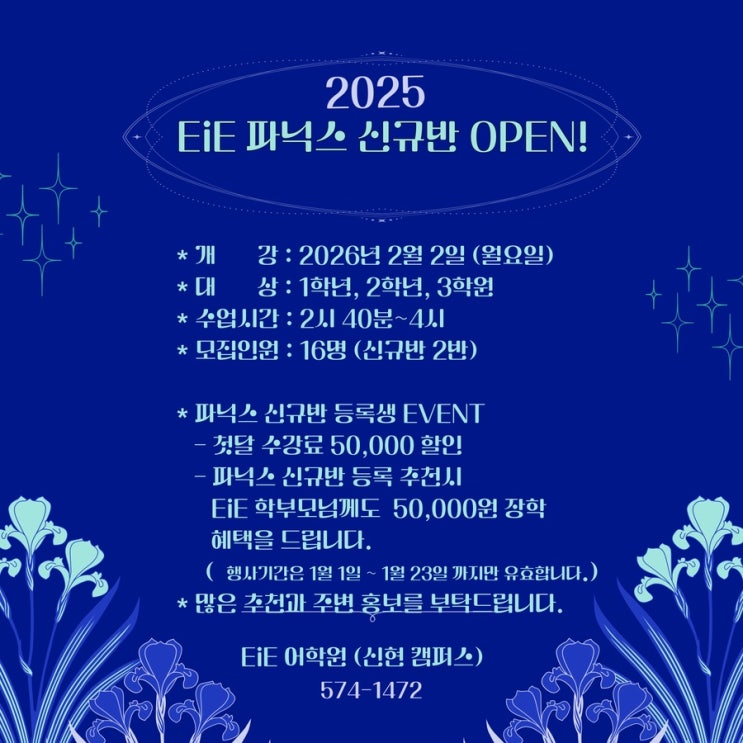 2026년 새학기 파닉스 기초반 모집 안내 새학기를 맞아 파닉스 기초반 정원을 모집합니다. 영어 학습의 시작이 되는 소리–문자 연결 원리를 체계적으로 지도합니다. 본 수업은 알파벳 인식부터 파닉스 규칙, 단어 읽기까지 단계별로 누적되는 커리큘럼으로 진행됩니다. 소수 정원(최대9) 수업을 통해 아이의 이해도와 속도에 맞춘 개별 피드백을 제공하며, 스스로 소리 내어 읽는 힘을 기르는 데 집중합니다. 영어를 ‘외우는 공부’가 아닌, 읽을 수 있는 언어로 시작하고 싶은 아이에게 추천드립니다. ✔ 대상: 초등저학년 ✔️시간:2:40~4:00 ✔️수업구성:교재+온라인학습 차량 or 레테 무료 가능 이 달 등록시 50,000원 할인....... <img src="https://blogthumb.pstatic.net/MjAyNjAxMThfNzEg/MDAxNzY4NzQzODgwMjc3.jjQYSs1ebT2pCeopKQzKCkHRWMMsiOKicPC5ZKspaTgg.GSOKIA9SyuJk1OAr6mCVy6azv279BGhoLQTOIyu9Qg0g.JPEG/IMG%A3%DF3514.JPG?type=s3" />