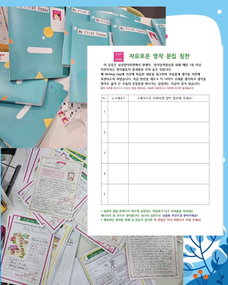 설 명절맞이 영작문집 칭찬이벤트를 기쁘게 잘 마쳤어요~ 이 이벤트를 시작하면서 학부모님께 구체적으로 콕 집어서 힘있는 칭찬을 해 주십사 부탁드렸어요! 특히 문집 주인공에게 스스로를 칭찬하도록 부탁했지요! 낯설고 어색한 칭찬이 당당하게 구체적으로 자기를 설명하고 표현하는 내용으로 변해가더군요! 긍정적인 시선으로 자신을 바라보고 스스로 발전을 약속하는 모습이 기뻤어요! 자신의 행동을 한 발자국 떨어져서 바라보는 과정이 우리를 자라게 합니다! 객관적인 나는 성숙한 감정과 태도를 키워줍니다! 타인과의 관계에서도 편안해 질 수 있어요~ 한 줄 한 줄 모든 칭찬이 소중하고 사랑스럽습니다! 우리들의 칭찬을 모았습니다! 제....... <img src="https://blogthumb.pstatic.net/MjAyNjAzMDNfMTc0/MDAxNzcyNTA3MTE4MzEz.RysVeryChEpjPnMuO-kb1DtDmMSHcjlUYfwh2nY4Dugg.SSCu9Rhy7vB7i0O6BqGDNgkGDpMgJx8TmzcyVJKVZWgg.PNG/26%B3%E22%BF%F9%C0%CC%BA%A5%C6%AE%BB%E7%C1%F8.png?type=s3" />