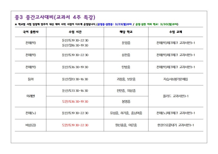 #신규반안내 호연지기 국어·논술 │ 중등부 중간고사 대비 안내 특강 일정 ▪ 문정중 · 삼천중: 3/23(월) ~ 4/19(일) ▪ 문정·삼천 이외 학교: 3/30(월) ~ 4/26(일) ※ 학교별 시험 일정에 따라 내신 대비 시작 시점이 다르게 운영됩니다. 수업 안내 ▪ 시험 약 4주 전부터 교과서 중심 내신 대비 수업으로 진행합니다. ▪ 특강 기간 동안 논술 수업은 휴강하고 교과서 내신 대비 수업으로 운영됩니다. ▪ 매 차시 숙제가 제공되며 시험 범위가 확정되는 대로 학교별 학습 범위를 안내하겠습니다. 운영 방향 ▪ 교과서 단원을 전체 흐름 중심으로 정리합니다. ▪ 시험 범위 단원은 지문과 문제를 더욱 자세하게 분석합니다. ※ 교....... <img src="https://blogthumb.pstatic.net/MjAyNjAzMTNfMzEg/MDAxNzczMzYyNjY0NjUx.1r1mgV5ath0ihuEF1fr3QUQdjWiK8Gx70M6WxfAM8RAg.9gs2htOoo-TvlHf-fcIsvI29IUKC5w3ar9gHbPbQS9wg.JPEG/KakaoTalk_20260313_093303795_01.jpg?type=s3" />