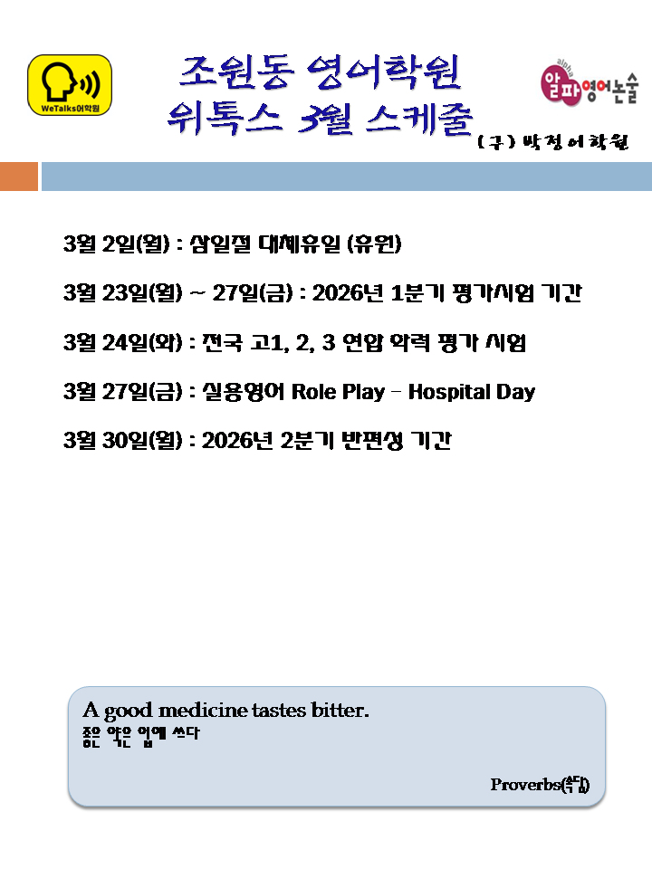 조원동 영어학원 위톡스 2026년 3월 스케줄입니다