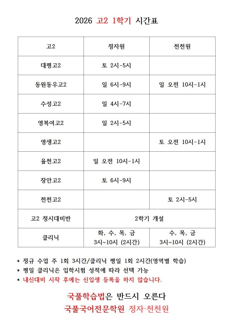 2026 고2 1학기 내신 시간표 수원 정자동 천천동 국풀 국어 학원