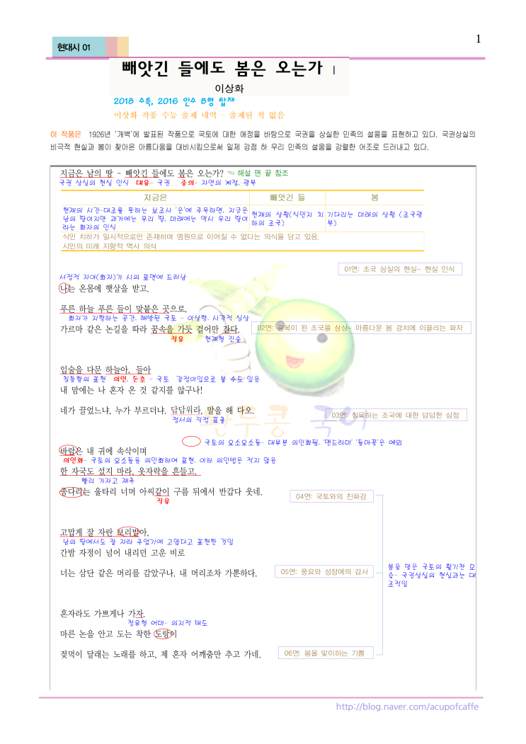 [의정부 국어학원] 2027학년도 수능특강 해설 - 완두콩 김두환 현대시01-가 빼앗긴 들에도 봄은 오는가 | 이상화 2018 수특, 2016 인수 B형 탑재 이상화 작품 수능 출제 내역 – 출제된 적 없음 이 작품은 1926년 ‘개벽’에 발표된 작품으로 국토에 대한 애정을 바탕으로 국권을 상실한 민족의 설움을 표현하고 있다. 국권상실의 비극적 현실과 봄이 찾아온 아름다움을 대비시킴으로써 일제 강점 하 우리 민족의 설움을 강렬한 어조로 드러내고 있다. [의정부 국어학원] 현대시01-가 빼앗긴 들에도 봄은 오는가(이상화) 해설 - 2027학년도 수능특강 / 완두콩 김두환 <img src="https://blogthumb.pstatic.net/MjAyNjAzMDJfMTk5/MDAxNzcyNDM5ODkwMjk2.gfY6ji1L3BRvdpBGyjfLjR12_N_HtDOgCYjvmI7oYrQg.CLcJhf65i3l9_fE7-Lw4rzuv7H1g5wqR2CG2aG3R2Igg.PNG/%C7%F6%B4%EB%BD%C301-%B0%A1_%BB%A9%BE%D1%B1%E4_%B5%E9%BF%A1%B5%B5_%BA%BD%C0%BA_%BF%C0%B4%C2%B0%A1%28%C0%CC%BB%F3%C8%AD%29_%C7%D8%BC%B3_-_2027%C7%D0%B3%E2%B5%B5_%BC%F6%B4%C9%C6%AF%B0%AD001.png?type=s3" />