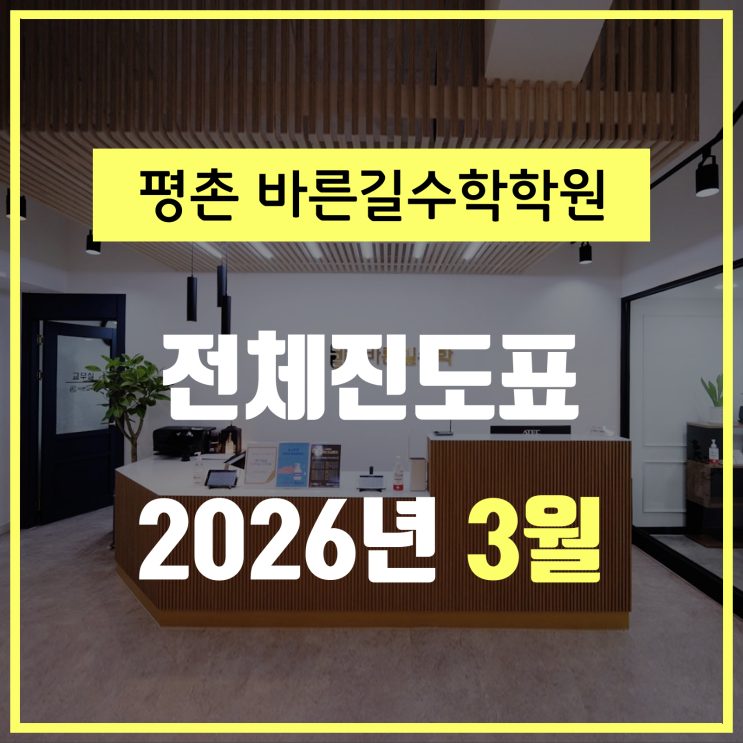 평촌 바른길수학 2026년 3월 시간표 초. 중등부 진도표 고등부 진도표(정규반) [평촌학원가 바른길 수학학원 오시는길] 초중등관 : 031)382 - 4785 평촌학원가 소방서 방향 평촌프라자6층(1층메가커피, 세븐일레븐) 고등관 : 031) 388 - 4785 (3/3일부터 가능) 평촌학원가 스타벅스 방향 신흥빌딩 2층(KB국민은행, GS25 건물 2층) <img src="https://blogthumb.pstatic.net/MjAyNjAyMjhfMTAy/MDAxNzcyMjQ1Nzk1MzM2.YqXExti9hyeUGt9X1ANEWEmGJQNq8dkGNfjRW-jV6O0g.SshOR4ZrZXWd3X5ZnqImdbK7Iq4mty3ILNhReWYXnWIg.PNG/202603_%BD%E6%B3%D7%C0%CF_%C0%FC%C3%BC%C1%F8%B5%B5%C7%A5.png?type=s3" />