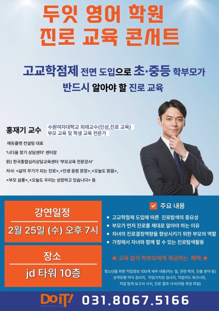최근 두잇 영어학원에서는 고교학점제 전면 도입에 맞춰 초·중등 학부모님들을 위한 진로 교육 설명회를 진행했습니다. 막연하게 느껴질 수 있는 고교학점제와 진로 설계를 조금 더 구체적으로 이해하실 수 있도록 이론과 실습을 함께 구성한 자리였습니다. 이번 설명회에서는 ✔ 고교학점제 도입에 따른 진로 탐색의 중요성 ✔ 부모가 먼저 진로를 이해해야 하는 이유 ✔ 자녀의 진로결정역량을 키워주는 질문법 ✔ 가정에서 실천할 수 있는 진로 탐색 방법 을 중심으로 진행되었습니다. 특히 단순한 강의 형식이 아니라 다중지능검사를 활용한 실습 활동을 통해 자녀의 흥미와 성향을 직접 확인해보는 시간을 가졌습니다. 아이들이 스스로 선택....... <img src="https://blogthumb.pstatic.net/MjAyNjAyMjdfMTUz/MDAxNzcyMTY3NDQ4NTU4.Ie3gG0n3hD05cOWty9pfXu2KagkTIG5R_nCRmzz-Dr4g.G2mpMSOg4-5JfYrxInwQCpMxBmz_RKjCTh83TslM604g.JPEG/4_b6bUd018svcoq9bwoi1lx11_3gr2ix%283%29.jpg?type=s3" />