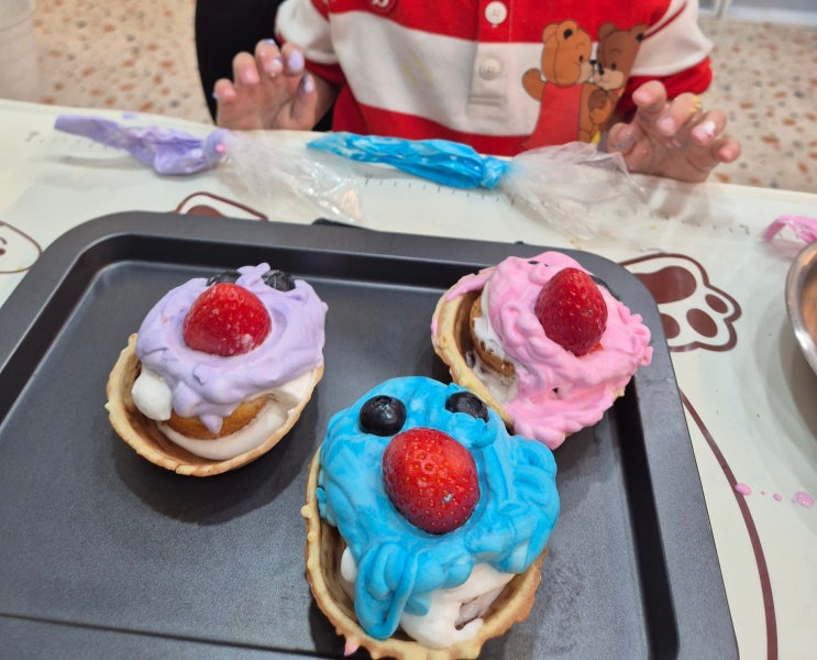 카스타드 케이크 재료 : 카스타드, 식용색소, 생크림, 설탕, 과일, 핫케이크 믹스(없어도 상관없어요.) 1: 핫케이크 믹스에 계란과 우유를 넣고 반죽을 만든다. 2. 와플틀에 1을 넣고 틀을 만든다. 3. 카스타드를 반으로 자른다 4. 틀안에 카스타드를 반개 넣는다. 5. 생크림을 만든다. (생크림 + 설탕) 5. 생크림에 색소를 넣는다. > 삼각 주머니에 넣어 준비하기 6. 자른 카스타드에 생크림을 짜고 과일을 올려준다. 7.나머지 카스타드 반개를 6위에 올린다. 8 남은 생크림으로 카스타드 주변에 올려주고 9. 과일로 꾸며 준다. 10. 포장해서 마무리!!!! 학부모님들이 맛있다며 연락을 주셨어요 ^^ 정말 뿌듯하답니다! 아이들 소근육 발달과....... <img src="https://blogthumb.pstatic.net/MjAyNjAyMjdfNzMg/MDAxNzcyMTk0NzE3MTcz.M8JBZ4lzb6FZeTyGz4wTRHFDf-8s-pqw85XY2HtQyQUg.8cAmu4_AvDM_cbtckMntz9TM4qvaNuzl8s_uCUT-190g.JPEG/20260224_201102.jpg?type=s3" />