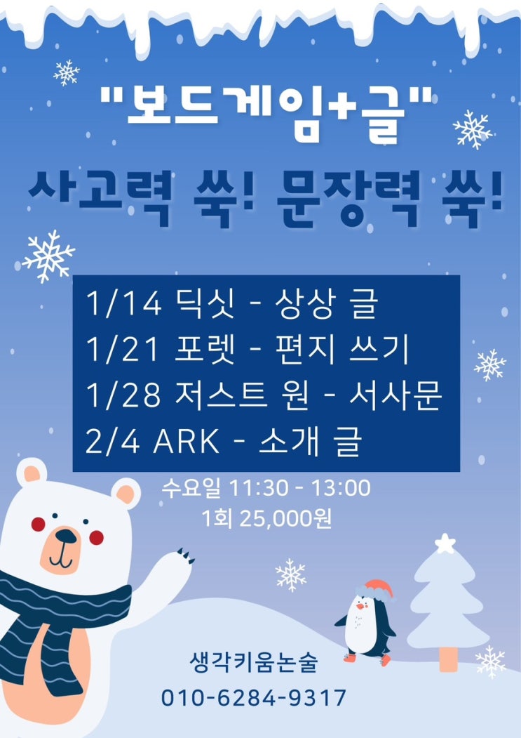 <“보드게임 + 글”> 곧 겨울 방학이 시작됩니다. 바깥 놀이가 힘든 친구들을 위해 보드게임으로 즐겁게 사고력을 쑥쑥 키우고, 갈래별 글 쓰기로 문장력도 쑥쑥 키울 수 있는 특강을 준비했습니다. 궁금하신 점은 언제든 전화 주세요.~ 010-6284-9317 #죽전논술 #수지논술 #새터마을논술 #내대지마을논술 #현암초 #현암중 #초등논술 #중등논술 #현암 #생각키움논술 #대덕초 #대청초 #대덕중 #한국사 #성현마을논술 #죽전하브루타 #겨울방학특강 <img src="https://blogthumb.pstatic.net/MjAyNjAxMDVfMTQx/MDAxNzY3NjE3NTAxNDUy.iWzob7_gLpt6sC6FGduTsUqKDwcOE0ZMYimNfFcSp6Qg.ymusqt-Z4UqrM4P2P3cPUQlpm_rMC63u3H6MjQDFChsg.JPEG/IMG%A3%DF8605.JPG?type=s3" />