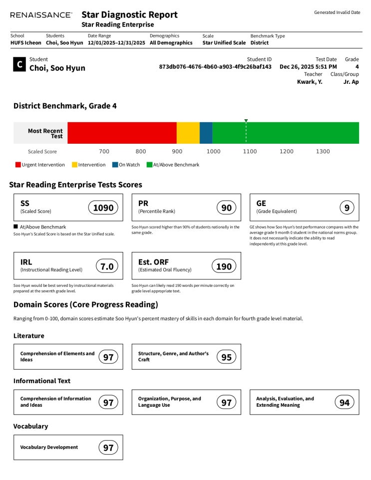 안녕하세요 이천영어학원 뉴욕프랩어학원입니다. 뉴욕프랩어학원에서는 한달에 한번씩 월말평가를 진행하고 있습니다. 오늘은 12월 월말평가를 진행하였습니다. 눈에 띄는 성장을 보인 친구에 대해서 작성해보고자 합니다. 초등 4학년 Lily의 르네상스 성장 기록 | 뉴욕프랩어학원 영어 실력은 단기간에 만들어지지 않습니다. 하지만 방향이 맞고, 꾸준한 반복이 쌓이면 변화는 반드시 숫자로 나타납니다. 뉴욕프랩어학원에서 수업 중인 초등학교 4학년 Lily는 올해 초 르네상스 평가 점수 5점에서 시작해 현재 9점까지 눈에 띄는 성장을 이루었습니다. 이 변화의 중심에는 매일 이어진 기본 습관이 있습니다. ✔ 하루도 빠지지 않는 원서 리딩 ✔....... <img src="https://blogthumb.pstatic.net/MjAyNTEyMjZfMTMg/MDAxNzY2NzU3NjUyMjU1.55-irdI-Xzm8-rhKVhVobV5jb05pZsfnZ5YmLurFvCsg.qct1u9ts7wUqKZFGWBp6-gJ9cVciwyVj3dmLtiGPPlcg.JPEG/b33ed33b-10e7-4677-a223-a25005109c53_page-0001.jpg?type=s3" />