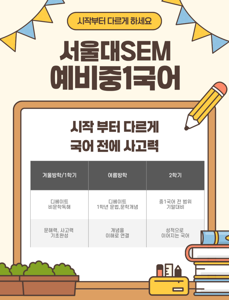 예비 중1, 국어는 왜 ‘지금’ 시작해야 할까요? 중학교에 들어가면 많은 아이들이 가장 먼저 흔들리는 과목이 국어입니다. 국어는 단순히 ‘국어 시간에만 필요한 과목’이 아니기 때문입니다. ✔ 문제를 읽고 핵심을 파악하는 능력 ✔ 자신의 생각을 논리적으로 정리해 쓰고 말하는 능력 ✔ 모든 과목의 시험 지문을 이해하는 문해력 이 모든 출발점이 바로 국어입니다. 그래서 ! 예비 중1 국어는 선행보다 ‘기초 구조를 만드는 과정’이 가장 중요합니다. 중학교 국어의 핵심은 ‘이해력’과 ‘사고력’입니다 초등 국어와 중등 국어의 가장 큰 차이는 분명합니다. 특히 중학교 국어에서는 왜 그렇게 생각했는지 근거가 무엇인지 ?....... <img src="https://blogthumb.pstatic.net/MjAyNjAxMDhfMTcw/MDAxNzY3ODYyMTA2Mjgy.NCCf8LdD4DKIy5GCUHdiTUP5vXd1QAXvDy7uCcKr8jkg.xCU86QItTeqSlZFenIewvgQTGGEyj2jnbTU22Eg7MF8g.PNG/%C1%A6%B8%F1%C0%BB_%C0%D4%B7%C2%C7%D8%C1%D6%BC%BC%BF%E4.png?type=s3" />