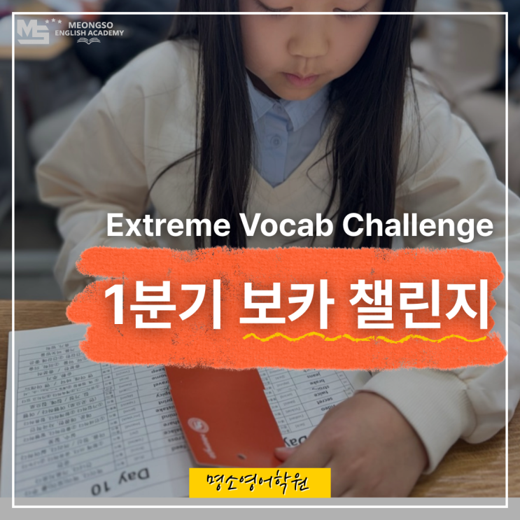 안녕하세요, 명소 영어학원입니다. 2026년 1분기 보카 챌린지 기간이 돌아왔습니다! 영어의 기본이자 핵심인 '어휘' 명소 영어학원은 분기마다 ‘보카 챌린지’를 통해 집중 몰입 주간을 운영합니다. 한 주 동안 단어에만 온전히 몰입하여 암기 속도와 정확도를 동시에 끌어올리는 명소 시그니처 프로그램입니다. 보카 레벨별로 상이하다만 4분기로 나누어 챌린지 기간을 가지고 있습니다. 왜 보카 챌린지일까? 영어 실력의 핵심이자 기초는 단어입니다. 레벨별로 학생들마다 같은속도로 암기하는 것은 아니기에 단어 암기에 유독 어려움을 겪고, 암기 속도가 느려 자신감이 떨어지는 학생들을 위한 특별 프로그램입니다. 또한 상위권....... <img src="https://blogthumb.pstatic.net/MjAyNjAyMDRfNDIg/MDAxNzcwMTczNzg2MTAy.d6nSuiLtFYtIgm3rvEryPMJ8beU_q_f4dbnh9p0sR3sg.-wpmw9pItzO0rzAJYS5f3Aa2bXaywT2t5ndhMXdLIvUg.PNG/%C1%A6%B8%F1_%C3%DF%B0%A1_%2826%29.png?type=s3" />