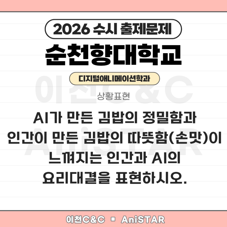 안녕하세요~! 이천 씨앤씨 미술학원입니다. 오늘은 26년도 순천향대학교 디지털애니메이션학과 수시 실기주제를 소개하려합니다~ 순서대로 상황표현/칸만화 주제입니다. 상황표현 AI가 만든 김밥의 정밀함과 인간이 만든 김밥의 따뜻함(손맛)이 느껴지는 인간과 AI의 요리대결을 표현하시오. 칸만화 AI가 만든 김밥과 장인이 만든 김밥이 대결하는 상황을 칸만화로 표현하시오. 시대가 발전함에 따라 주제 역시 현대 기술의 발전과 밀접한 관련을 가지는 추세입니다. 이에 대해 평소에도 꾸준히 고민하고 탐구한다면 좋은 아이디어로 이어질 수 있을 것 같습니다~!! 미대입시 이천씨앤씨와 함께해요~!! 모든 수험생들과 실기생들 화이팅~!! 저희....... <img src="https://blogthumb.pstatic.net/MjAyNjAzMjZfMTU0/MDAxNzc0NTAzODI2MzY4.HYIjmcAXKPRZA4__LBxYj50l9bOATGQLW3BR_mG9BxYg.HNudC6cHrlfiKitfwBDXJD_QH9jAPAXhJj33OtKvCOAg.PNG/%C7%D0%B1%B3%BA%B0_%BC%F6%BD%C3_%C1%D6%C1%A6%28%BE%D6%B4%CF%29_%281%29.png?type=s3" />