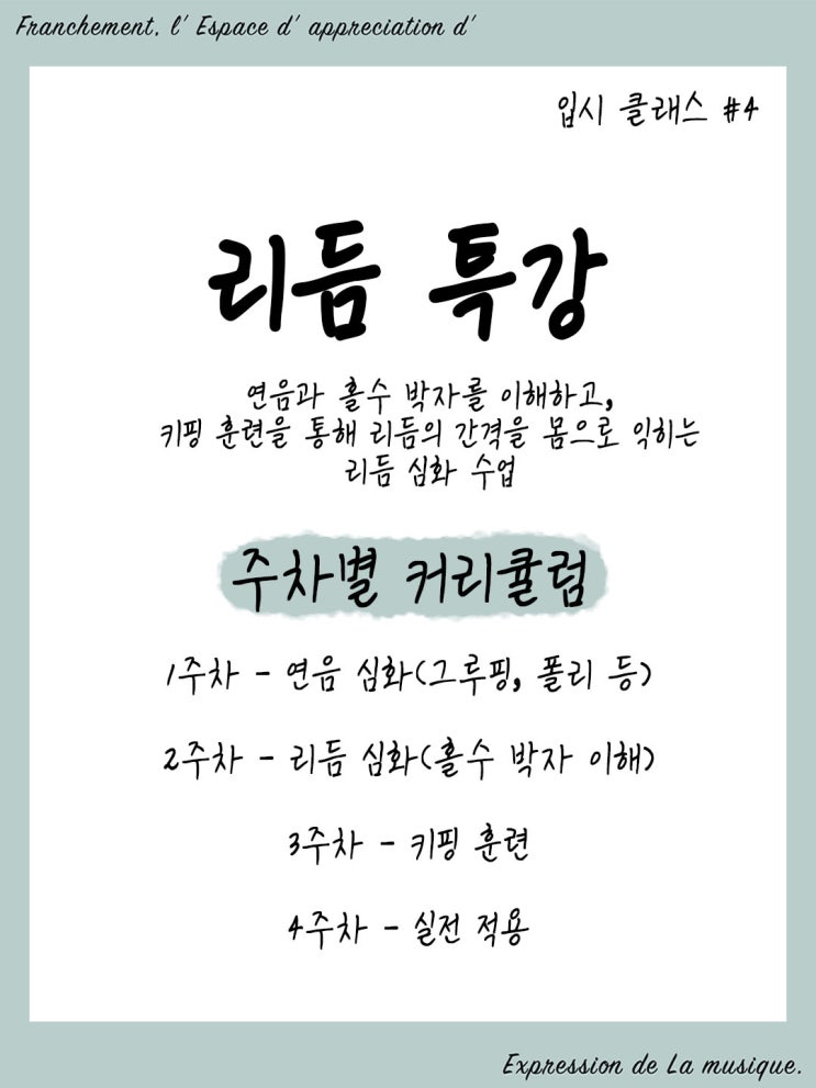 안녕하세요 필뮤직아카데미입니다 :) 입시반, 취미반 보컬, 기악, 작곡 모든 전공이 참여할 수 있는 리듬 특강을 진행합니다! ⊙일시⊙ 4/6 ~ 4/27 월요일 7:30pm (60분) ⊙장소⊙ 댄스홀 ⊙대상⊙ 입시반 수강생 ⊙커리큘럼⊙ 1주차 연음 심화(그루핑, 폴리 등) 2주차 리듬 심화(홀수 박자 이해) 3주차 키핑 훈련 4주차 실전 적용 예고 합격생 ▼▼▼ 예대 합격생 ▼▼▼ 상담&문의 ☎️010-4676-4491☎️ <img src="https://blogthumb.pstatic.net/MjAyNjAzMjdfMTA2/MDAxNzc0NjAzMDgyOTA1.N3Y2lep-fX8EYayFRE2H04b6GSTAR5xOOizt4q_0dxsg.3PpuHXZZmcEvUcPEJgNtJhyye7relAIi53a8wvOlBQog.JPEG/%B8%AE%B5%EB_%281%29.jpg?type=s3" />