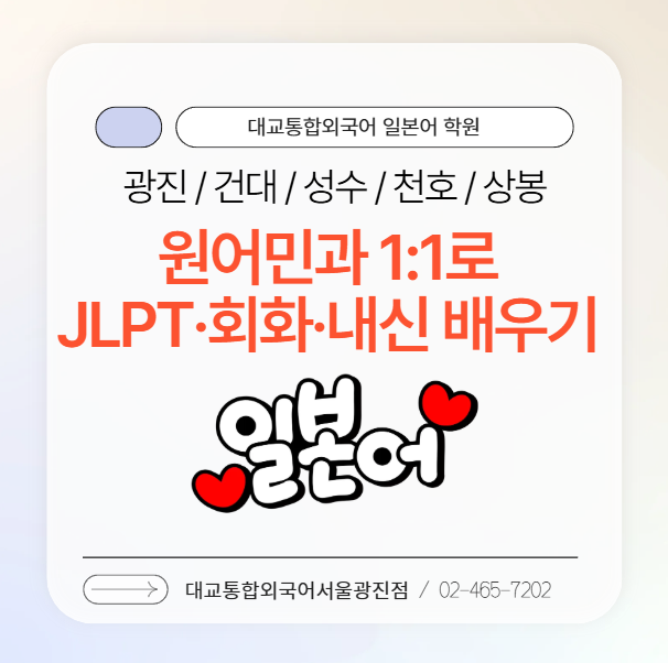 안녕하세요! 건대 일본어학원 대교랭퀴지스퀘어 광진점입니다! 여러분은 어떤 목적으로 일본어를 배우려고 하시나요? 일본 여행을 준비하는 분들 JLPT 자격증을 준비하는 학생 일본어 내신 대비가 필요한 학생 취미로 일본어 배우는 분들 유학/워홀 준비하는 분들 ... 다양한 이유로 일본어 공부를 시작하고 있을 거 같아요. 그래서 오늘은 저희 천호 일본어학원에서 진행되는 일본어 수업 방식과 특징, 그리고 실제 수강생 후기를 간단히 소개해 드리려고 합니다. 저희 학원은 일본어 원어민 강사 유학파강사 1:1 맞춤 수업 / 개인 맞춤 커리큘럼 시간·장소 선택 수업으로 중고등 내신 1등급 수능1등급으로 만들어드려요. (학원/가정방문/스터디....... <img src="https://blogthumb.pstatic.net/MjAyNjAzMTRfMjM1/MDAxNzczNDk0MDkyMDA3.rX_TYh8REXv5xE5BTdceMS8izTb4IqoWozfQ8cUXVbUg.MIdHAF5t0HyajgyIp8WmukE-5qVULd4EpTMXQCTK8tIg.PNG/image.png?type=s3" />