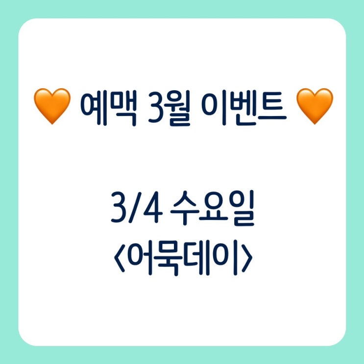 안녕하세요~ 예맥학원입니다! 어느새 3월 개학을 앞두고 있는데요~~ 새로운 학년, 새로운 반, 새로운 친구! 두근두근 새학기를 맞이하여 특별한 3월 이벤트를 준비했습니다~!! 3월 4일 수요일에 어묵데이를 진행합니다! 친구초대는 1명까지 가능하구요~ 학교 끝나고 예맥으로 오시면 되는데요! 따뜻한 어묵꼬치 다들 좋아하시죠??ㅎㅎ 맛있는 어묵이 기다리고 있을테니 얼른 오세요!! 우리 예맥 친구들의 새로운 시작을 응원하는 마음에서 준비한 이벤트인데요~~!! 맛있게 먹고 힘내서 새학기도 화이팅해봅시다!!! <img src="https://blogthumb.pstatic.net/MjAyNjAzMDFfNTAg/MDAxNzcyMzMwODQxNDU2.EpXX-IXZAYBAAjL0aZgA2Y-leAOXtiNmWVHBodyynxYg.Rpq5s-wbIa-TTCo2BmXLgqs6tpkeMl9255ITgDi0NSwg.JPEG/IMG%A3%DF4030.JPG?type=s3" />