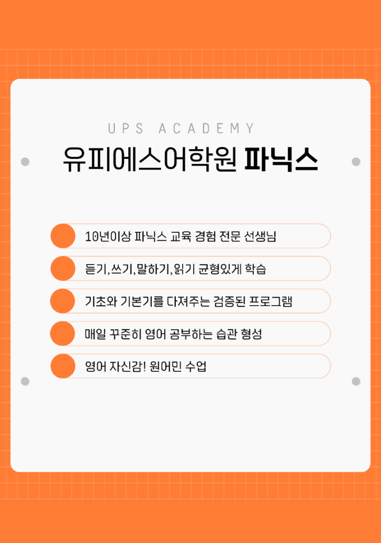 26년 1월에 시작한 파닉스반들은 모두 정원 마감했습니다^^ 3월 되면 파닉스반 문의를 많이 해주시는데 저희는 미리 예약해준 친구들과 시작되서 3월이면 마감된 경우가 많습니다. 올해 추가 개강은 9월 예정으로 지금 예약 받고 있습니다. 파닉스반 정원은 6명! 주5일 50분 수업! 원어민 수업 포함 1년간 할인혜택 정원 마감되면 추가로 받지 않습니다. 왜 유피에스어학원에서 파닉스를 시작해야 할까요? 영어는 빨리 보다 제대로 시작하는게 중요합니다^^ 아이들의 속도에 맞춰 즐겁게 배우고 자신감 있게 말하는 영어 시작의 다름 유피에스어학원에서 가능합니다! 현재 파닉스 2학년반 원어민 수업 영상입니다! 다음번에는 한국인 선생님과 즐....... <img src="https://blogthumb.pstatic.net/MjAyNjAzMTdfNiAg/MDAxNzczNjkxMTM1MTgz.JPBUB0RRofi6QSVsr-Dr0kzn6py_7ZlNimzPp6x4AZwg.7vcrgQ4gZkHVWPmngwluURO-iVr_DQHLTqZ23h1g86Ig.PNG/900%A3%DF%C1%A6%B8%F1%C0%BB_%C0%D4%B7%C2%C7%D8%C1%D6%BC%BC%BF%E4.%A3%AD23.png?type=s3" />