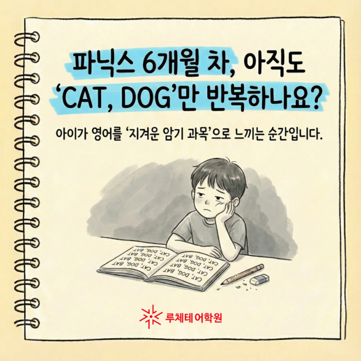 영어를 오래 배웠는데도 단어를 혼자 읽지 못한다면, 시작점이 달랐을 수 있습니다. 주성동 루체테 파닉스 3월 신규반이 3월 3일 개강합니다. 초등 저학년을 위한 6개월 완성 오감식 파닉스 과정입니다. 보고, 듣고, 말하고, 쓰는 오감식 수업으로 아이 스스로 읽는 힘을 만들어드립니다. 오감식 파닉스란 무엇이 다른가 주성동 루체테 오감식 파닉스는 눈으로만 배우는 수업이 아닙니다. 보고, 듣고, 말하고, 쓰는 과정을 반복하며 소리를 체화하도록 설계된 프로그램입니다. 그림을 먼저 보여주고 단어를 외우는 방식이 아니라, 글자를 보고 소리를 조합해 읽어내는 힘을 기릅니다. 아이들이 스스로 읽는 순간을 경험하도록 만드는 것이 가....... <img src="https://blogthumb.pstatic.net/MjAyNjAzMDJfMTMg/MDAxNzcyNDE2MzIwMTQ1.wO9rySH-CpiRckVXElOZeCpU3d33_EeuJC9y7bYt8qcg.EMcfV1GNL-p4IfurnHqp3-yrmPJvTyqIs6-movg8tZkg.PNG/001.png?type=s3" />