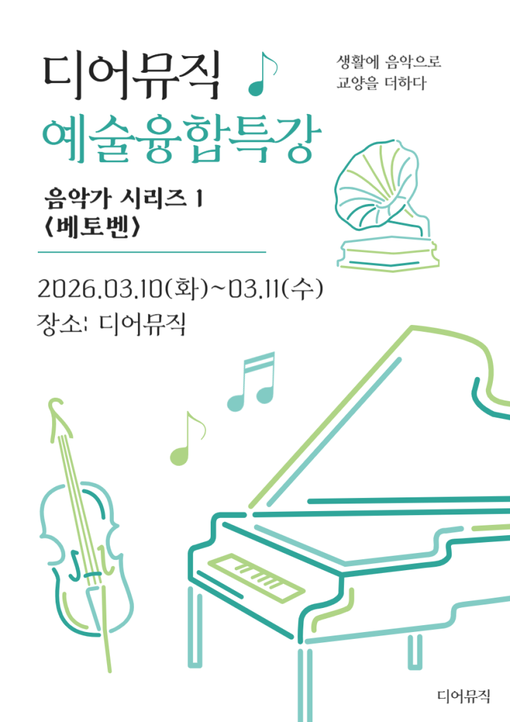 안녕하세요 " 즐겁게, 정확하게 배우는 피아노 " 디어뮤직 입니다. 봄이 다가오는것 같으면서도 매서운 칼바람에 아직은 추운 것 같은 요즘입니다ㅠㅠ 어서 따뜻한 봄이 왔으면 좋겠어요~ 이번 달 디어뮤직 예술융합특강은 음악가 시리즈 제 1탄 " 베토벤 " 입니다! 베토벤은 누구나 알고 있을 만큼 유명하고 위대한 음악가예요. 이번 특강때는 삽화와 애니메이션으로 재미있게 베토벤의 생애에 대해 알아보고, 청력을 잃은 베토벤이 과연 어떻게 위대한 곡들을 작곡했는지 좀 더 깊~게 알아보는 시간을 준비했어요~ " 선생님 !! 엘리제를 위해서에서 엘리제가 베토벤 여자친구예요????"란 질문에 번외로 왜 엘리....... <img src="https://blogthumb.pstatic.net/MjAyNjAzMTNfMTYz/MDAxNzczMzc3MDc3NTAz.4gXEThuhmrjFuNVbcst1IpFfjwIHqa6rlNCIt6sUVfcg.LDKRgi9xbS36rAXaA3nzFSPMEFPhvPa2OSPCO8rT5Log.PNG/3%BF%F9%C6%AF%B0%AD.png?type=s3" />