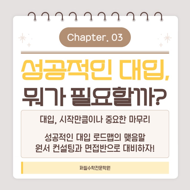 안녕하세요! 퍼씰수학전문학원입니다. 오늘은 성공적인 대입, 뭐가 필요할까? (1), (2) 에 이어 이 시리즈를 마무리하는 내용으로 이번 포스팅을 구성해보았는데요! 성공적인 대입, 시작도 끝도 퍼씰과 함께 퍼씰은 학생들의 성공적인 대입을 위하여 그의 시작부터 끝까지 함께 하고자 하는데요, 앞선 내용들에선 그 시작과 과정들을 살펴보았으니 오늘은 어떻게 마무리를 짓는지 함께 살펴보려고 합니다. 과연! 어떤 프로그램을 통해 우리 아이들을 성공적인 대입으로 이끌까요? 8. 원서 컨설팅 9. 면접반 10. 따뜻한 수학 이렇게 세 가지를 마지막으로 성공적인 대입을 위한 과정을 마무리 해주고자 합니다. 그 전에! 이전 시리즈들을 읽지 않....... <img src="https://blogthumb.pstatic.net/MjAyNTEyMDZfMTc5/MDAxNzY1MDAxODc5NDc5.OJV6V9by1U6wGY7w0eit1AKTcesFpstUugNFVXLLE6Ag.EB0EnUPNZgBMUeclyBRaHRNwPZ7pUXjYwC0iUHq-2mQg.JPEG/%B9%CE%BC%D6%C0%C7_%B0%CD.3.jpg?type=s3" />