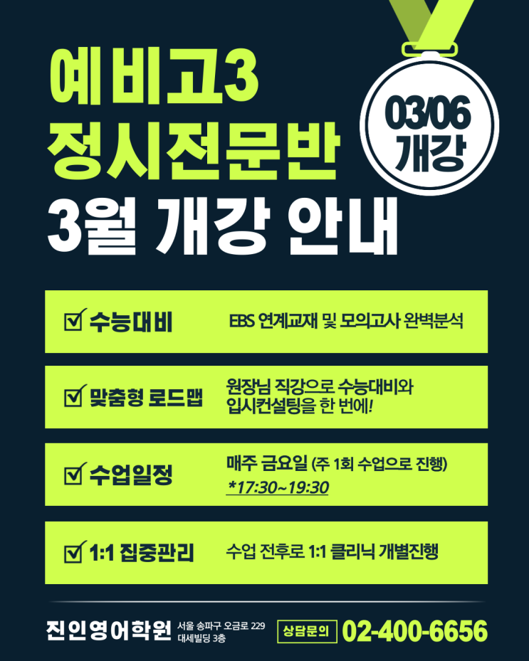 [송파구 영어학원] 진인 영어학원 예비고3 정시전문반 3월 개강안내