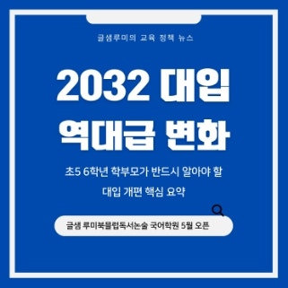 안녕하세요 글샘루미입니다♡ , 지금 초등 5, 6학년 자녀를 두셨다면 오늘 글은 공부의 이정표가 될 것입니다. 최근 서울시 교육청이 발표한 대입 개편안, 보셨나요? 단순히 시험이 바뀌는 수준이 아닙니다. 교육의 판이 통째로 뒤집히고 있습니다. "우리 애 대학 갈 때 수능이 없어진다고요 서울시 교육의 이번 안에 따르면 2032학년도부터 대입 대변혁이 시작됩니다. 핵심은 딱 세 가지입니다. 내신·수능 절대평가 전환: 1등급 따기 전쟁은 끝났습니다. 이제 '점수'보다 '역량'입니다. 논·서술형 수능 도입: 객관식 찍기 시대는 안녕! 자기 생각을 글로 못 쓰면 대학 문턱도 못 넘습니다. AI 자동 채점 시스템: ....... <img src="https://blogthumb.pstatic.net/MjAyNjAzMDFfOTIg/MDAxNzcyMzUzODY5NDg1.h5kEiFqwAje9VUO3P5XrV6rY_N92ddP2h6iY0frOmigg.mvMqyc9FIslvu5JoEOAvIoYOgQJt5N3DnrLFrwI01DUg.JPEG/320%A3%DF1%A3%DF20260301%A3%DF173026%A3%DF0000.jpg?type=s3" />