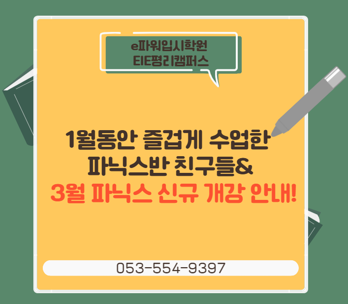 안녕하세요. e파워입시학원 EIE평리캠퍼스입니다. 1월 한 달 동안 파닉스반 친구들과 정말 즐거운 시간을 보냈어요. 수업 시간마다 웃음이 끊이지 않았고 수업에 잘 참여해주었답니다. 그 결과 1월 파닉스반 그리스반·옥스퍼드반 모두 마감되며 많은 관심을 받았습니다. 이런 성원에 힘입어, EiE 평리캠퍼스에서는 2026년 3월 신학기 파닉스반을 새롭게 개강합니다. 신학기를 앞두고 영어의 첫 단계를 제대로 시작할 수 있도록, 파닉스 기초부터 차근차근 다지는 수업으로 준비하고 있어요. 이번 3월 개강을 맞아 신학기 개강 기념 이벤트도 함께 진행합니다! ✔ 대상 : 초등학교 1~3학년 신규 등록생 ✔ 이벤트 기간 : 2월 1일 ~ 3월 31일 ....... <img src="https://blogthumb.pstatic.net/MjAyNjAyMDJfMjIx/MDAxNzcwMDEwNzA2MTY2.jgg_lvntu7YzusznUIEY_3nfUmt1B3kL8No6GlsshSEg.j2QVb_hTXb8pBHLhlCi-FBL8OBT4LscHDQtNa7pFuZYg.PNG/image.png?type=s3" />