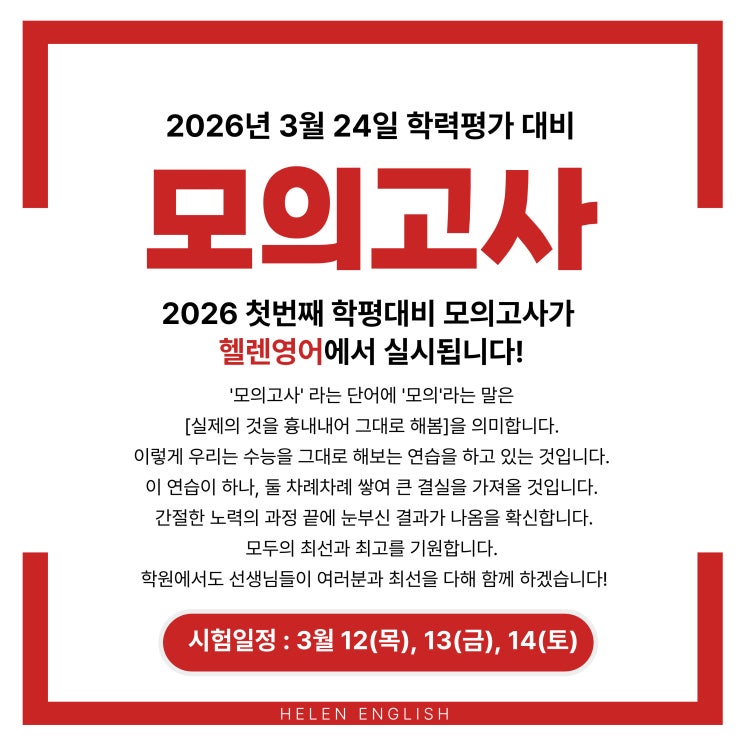 독보적인 영어교육, 시지 헬렌영어의 고등전문관 써밋관입니다. 3월 24일 화요일 전국 고등학생들을 대상으로 전국연합학력평가가 실시됩니다. 고1 학생들의 경우 고등학교 입학 후 처음으로 치르는 이번 시험을 통해 학생들의 현재 수준과 추후 보완점을 확인하고 공부의 방향을 보다 구체적이고 심도있게 설정하는 데 있어서 그 첫 토대를 쌓게 될 것입니다. 이에 학원에서는 본시험에서 오는 긴장감을 다소간 해소하고 원활하게 본시험을 치를 수 있도록 유사한 난도의 시험지로 실제 시험장과 동일한 환경에서 진행되는 시뮬레이션 모의고사를 진행하고자 합니다. 학원에서의 사전 모의고사 시험을 통해 고등학교 첫 모의고사에 대한 출발을....... <img src="https://blogthumb.pstatic.net/MjAyNjAyMjhfMjYz/MDAxNzcyMjUzODE5MDMw.1s4xSI2Yw6B376ZNMOHf32D9qnvIdPQLYNiz5wSDCEwg.-pMHyqB0fNJ_Djlz3a-YyosDFhjgUvcQDLM74lcBThog.JPEG/%C1%A6%B8%F1%C0%BB-%C0%D4%B7%C2%C7%D8%C1%D6%BC%BC%BF%E4_-001_%285%29.jpg?type=s3" />